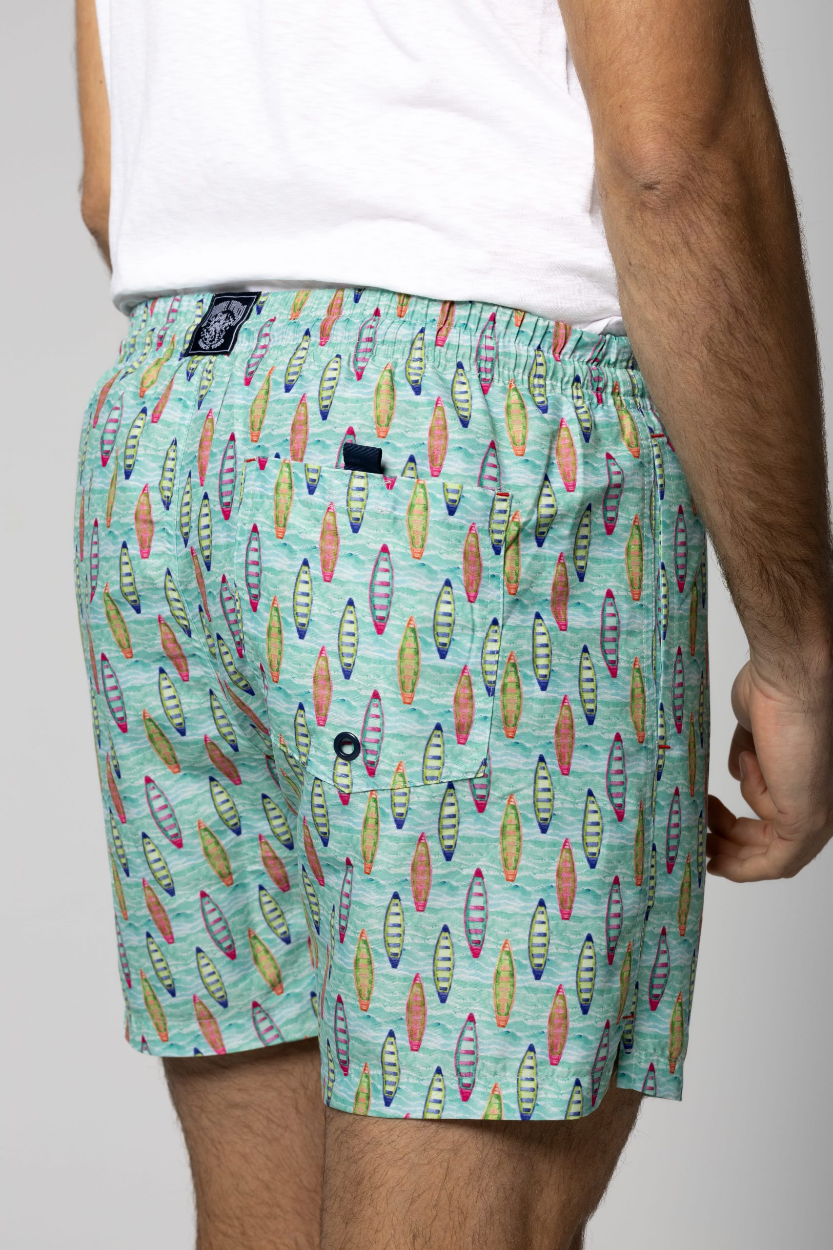 Bañador verde para hombre con originales dibujos de canoas, ideal para destacar en la playa o la piscina. Confeccionado en tejido ligero y de secado rápido, ofrece comodidad y un diseño divertido con toque veraniego.