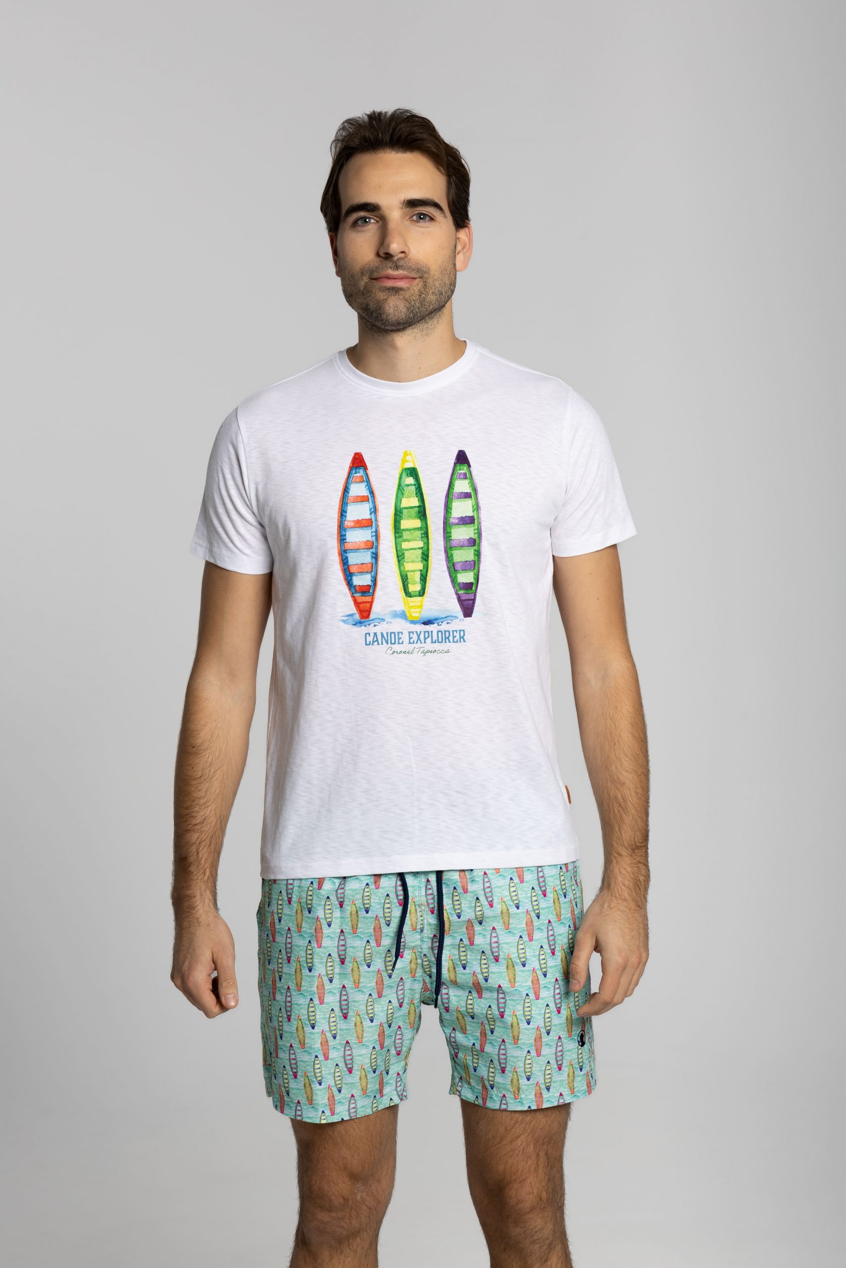 Camiseta blanca para hombre con estampado de canoas que aporta un toque fresco y original. Fabricada en tejido suave y transpirable, ofrece comodidad y un diseño casual ideal para el día a día.